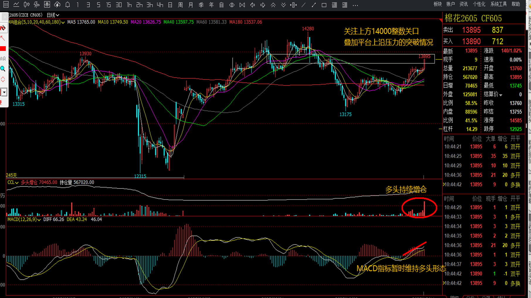 郑棉:价格方面,郑棉2605合约价格开始测试上方平台上沿14000的压力,技术指标MACD指标多头量能量柱体以及快慢线维持多头形态,均线系统维持多头排列,持仓最近以多头增仓为主导,整体看短期还有上涨动能。